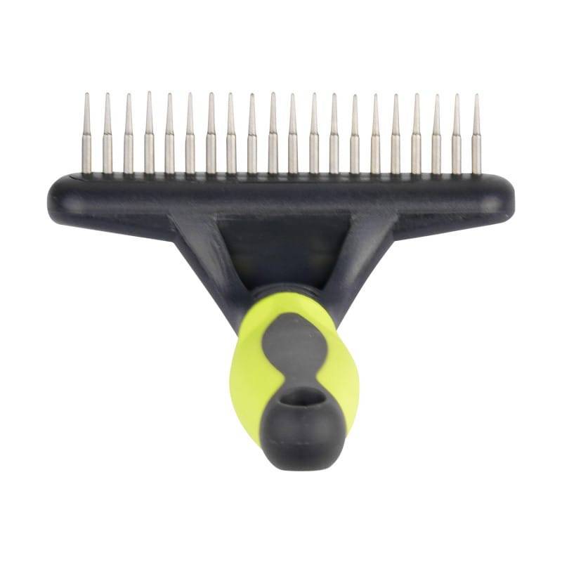 Thanks to its long and rotating teeth, the robust coat comb from Teqler is suitable for effective and gentle detangling of long coats. The rubberised, ribbed and ergonomically shaped handle lies particularly well in the hand and also has an eyelet for hanging the grooming comb.