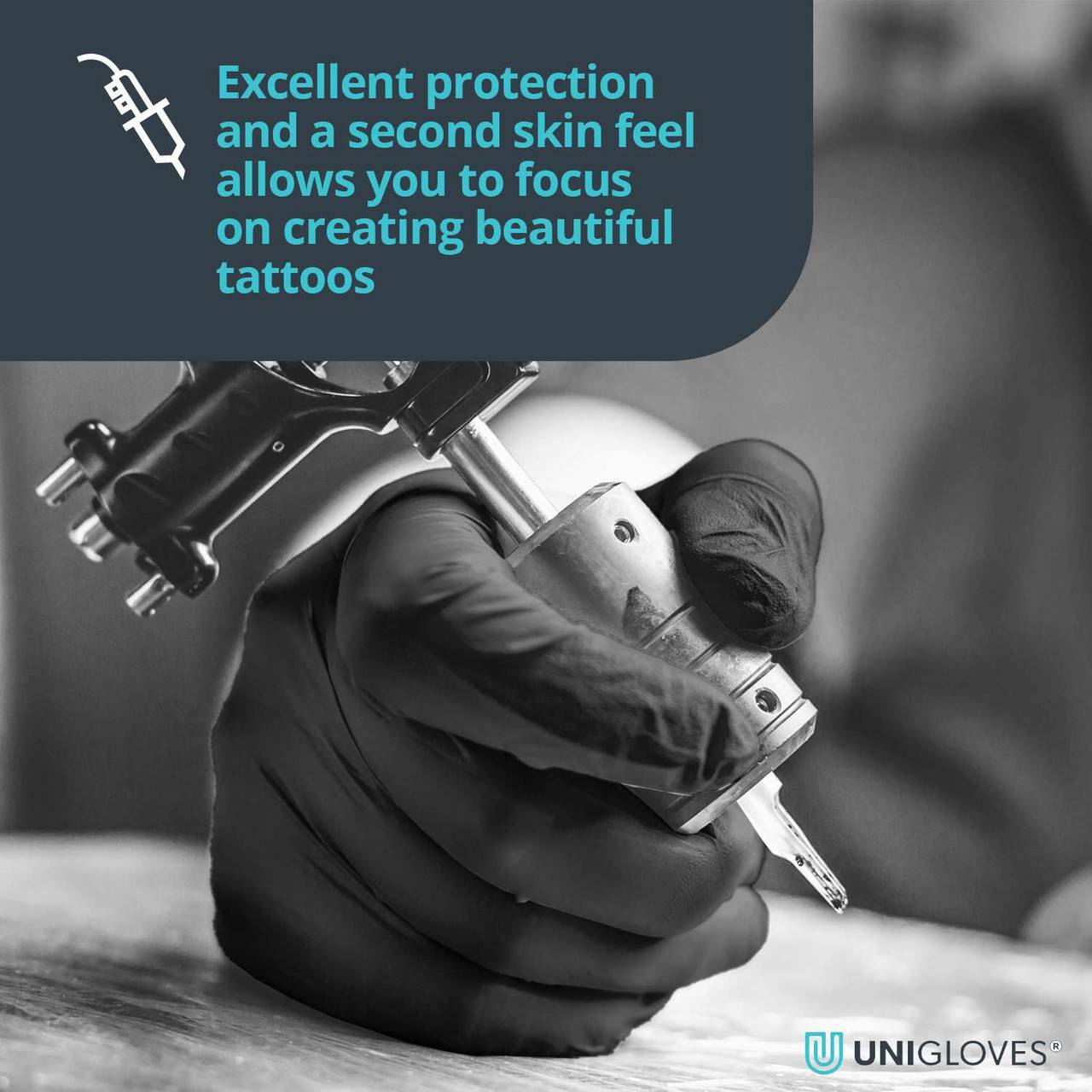 - Created for tattoo artists and beauty industry work, offering optimal protection with a matt black finish that masks blood and ink and reduces hand and eye strain when working on complex tasks